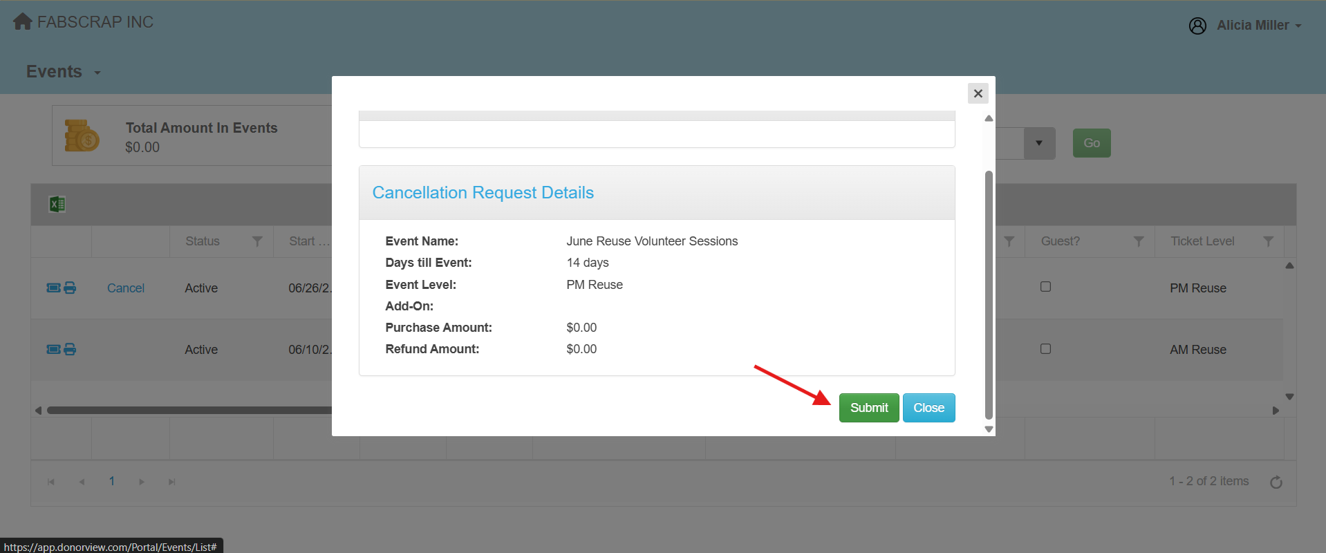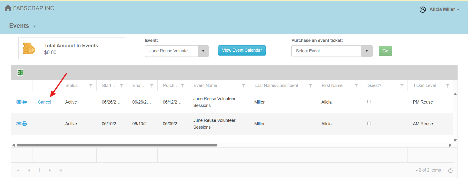 To cancel a volunteer session or event registrations in your Donorview account, follow these Step-by-step instructions to cancel your ticket.