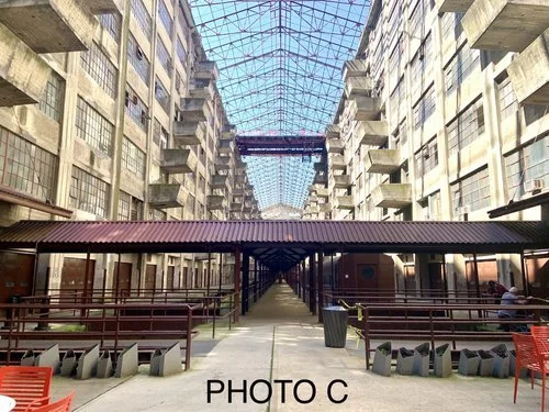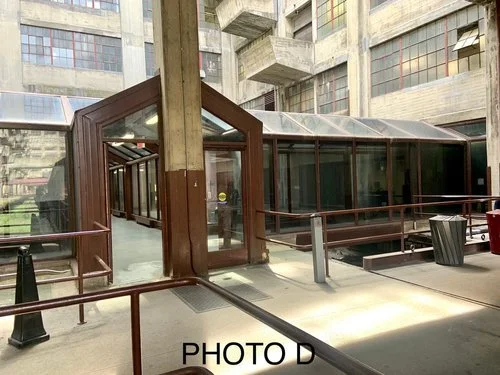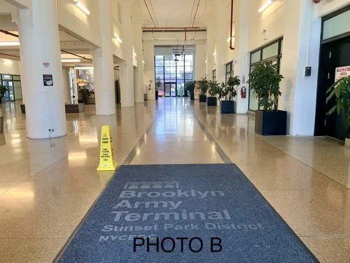 Walk toward the buildings labelled Brooklyn Army Terminal and pass the first building. You will go up a ramp and pass under an arch. Building B will be the second large building on your right, farthest from the water. When you enter the building, walk all the way to the back of the lobby and go through the glass doors to the atrium with the train tracks. Walk along the center pathway to the VERY END of the atrium, where you'll go through another glass door. Use the elevator on your right to come up to the 5th floor. Go through the door on your left. This route is accessible with ramps and elevators.